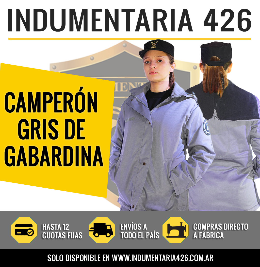 El camperón es de gabardina impermeabilizada, la capucha es desmontable y tiene cierre en los laterales en la parte inferior. Con abrojo para identificador bordado (sin identificador). Este producto viene en color gris, con talles desde XXS al ESPECIAL. Especialmente diseñado para el invierno.